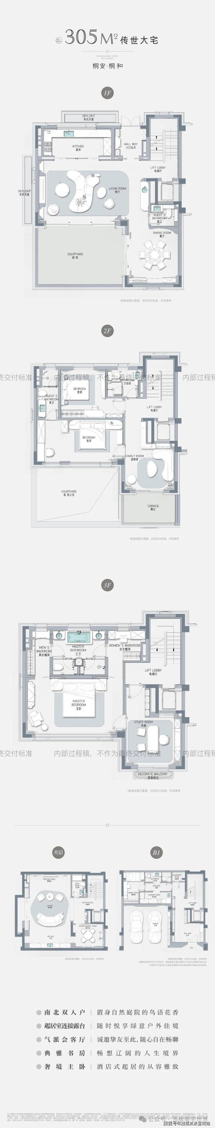 我们以项目主力的建面约300㎡户型来对比:首先,有天有地有院子是每个中国人藏在骨子的浪漫!桐安里的风貌联排联排直接独门独户,上下五层顶天立地,门前庭院则为孩子提供了一方亲近大自然的私密场所,也击中了养宠人士的心趴。
