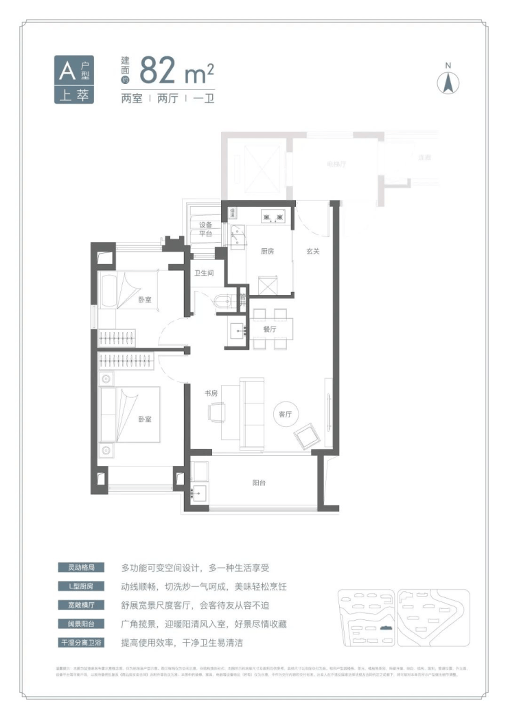 U型厨房、餐厅、客厅、阳台一线联通,南北通透。主卧套房、全卧飘窗、次卫干湿分离也都是标配。