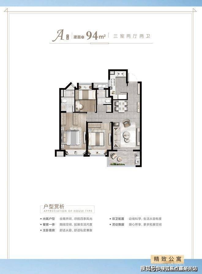 建面约94㎡3房2厅2卫户型特点: 做到了三开间朝南+主卧套房设计+全卧飘窗+动静分离+卫生间干湿分离,功能性与空间感完美结合的3房“神户型”。