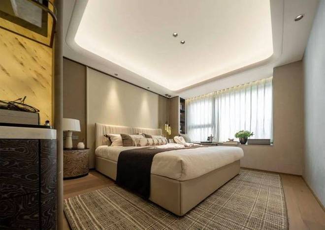 主卧背景墙内嵌金属线条,既是点睛装饰,又巧妙拉伸空间纵深感。
