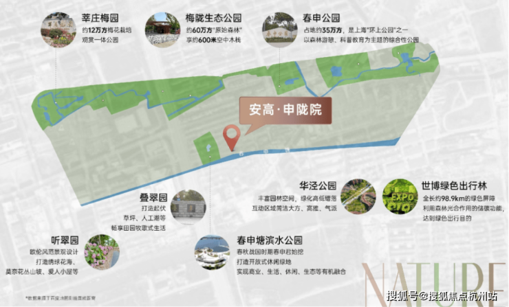 生态资源方面:周边分布约60万方的梅陇生态园、约30万方的西岸自然艺术公园、约81.8万方的上海植物园等一众自然绿肺,恢弘伟岸绿意环抱,在整个上海主城,异常珍贵难寻!