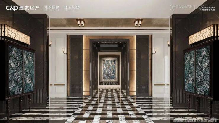 项目整体在外观上非常庄严大气,超10米的整块复古黄铜锤纹牌匾上,写着【建发海阅首府】6个大字,这经典的阵列柱式,有没有让你想到什么?