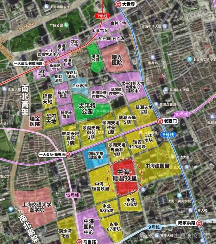中海・顺昌玖里雄踞上海真正的城央烫金地段 —— 黄浦区新天地 。这里是上海的心脏地带,是城市繁华与历史底蕴的交融之所。周边汇聚了上海顶级的商业、文化、娱乐资源,成为无数人向往的生活主场。