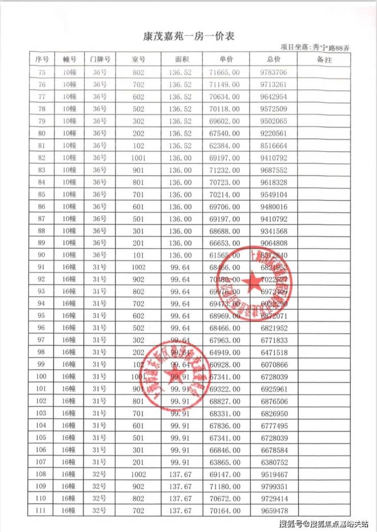一房一价表如下: