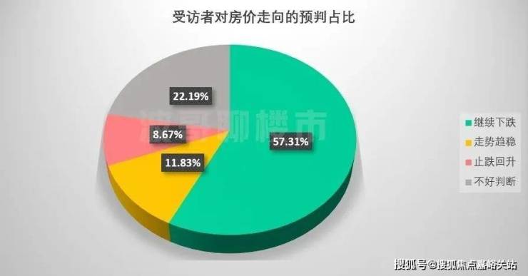最新调查结果显示,有 57.31%的人认为后市房价继续下跌,选择走势趋稳的受访者占 11.83%,认为会止跌回升的人则仅有 8.67%。