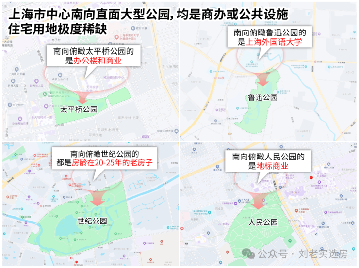 具体到上海,你会发现市区南向俯瞰大型优质公园的房子,有也只是20年以前的老房子。