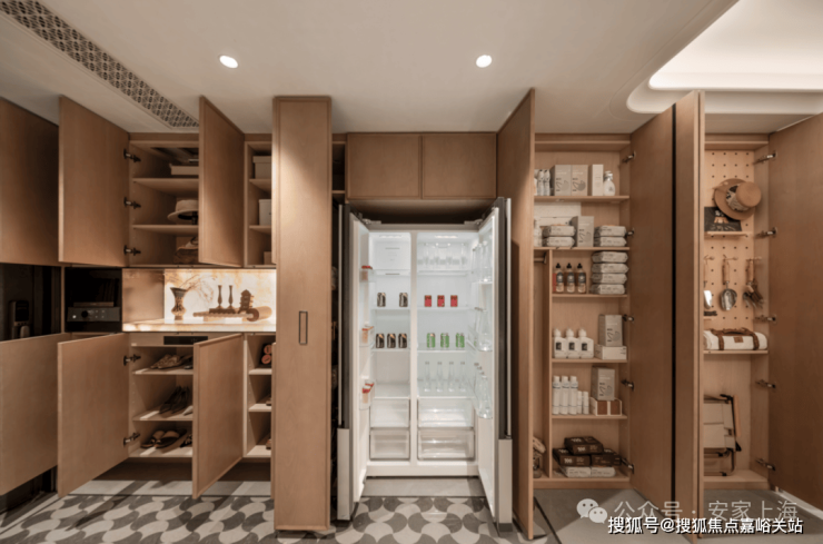 比如入户部分的玄关柜、墙柜、餐边柜等,都做了整排一体化。前期同样使用大受好评的 S墙设计依旧得到延续,冰箱可以平整嵌入,大方美观。