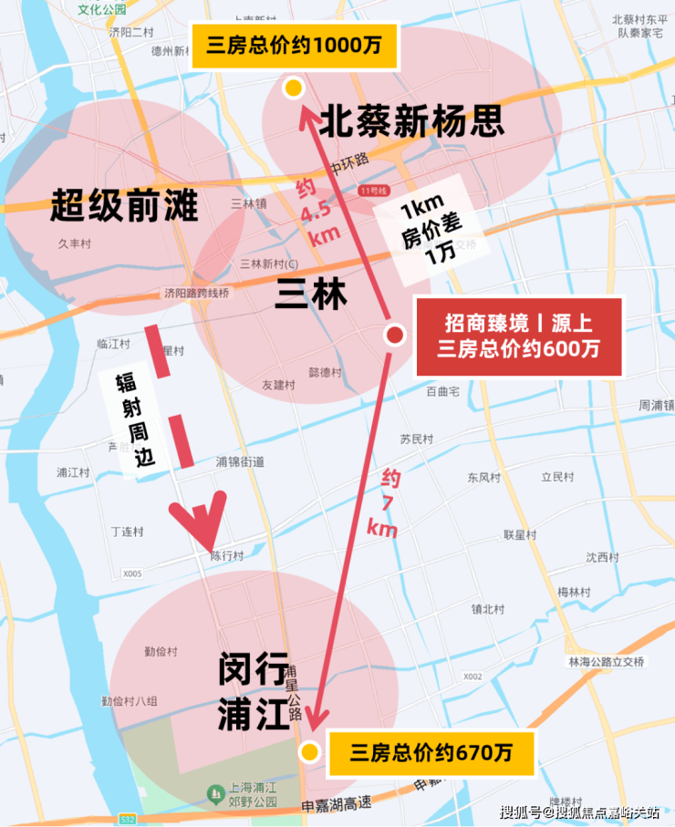 而招商臻境单价则依旧处于性价比十足的“6”字头, 建筑面积约95㎡三房总价仅约600级,相比之下,北面直线距离约4.5km的北蔡新杨思,板块在售新房单价陆续超10万+/㎡,想买三房预算需破千万,每隔1km房价就几乎相差1万。