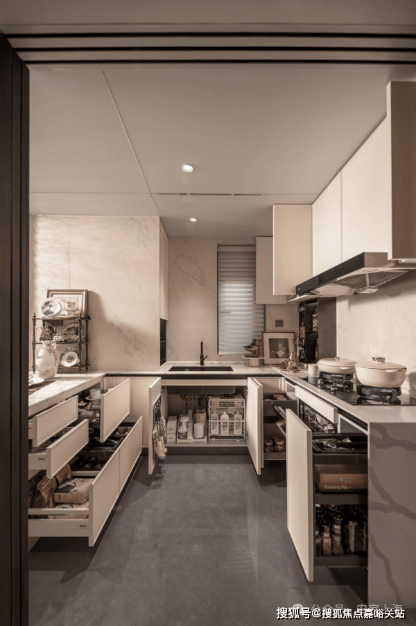 厨房更是堪称美食达人的天堂,集成一系列 多功能调味拉篮、定制谷物抽屉等,收纳有序,油盐酱醋间的分类放置烦恼一次性得到解决,琐碎繁杂不再。