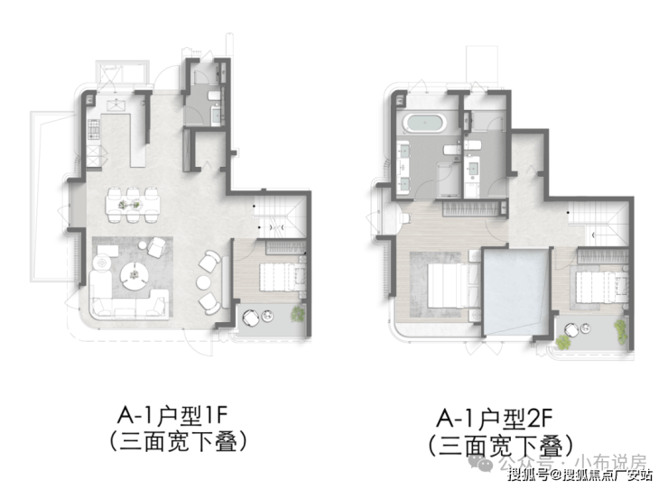 再来看项目的叠墅产品:约9.5米南向三面宽、独门独户设计,下叠享有约6.1米挑高地下室,上叠则配备超大露台,将墅居的空间尺度与功能延展性发挥到极致。