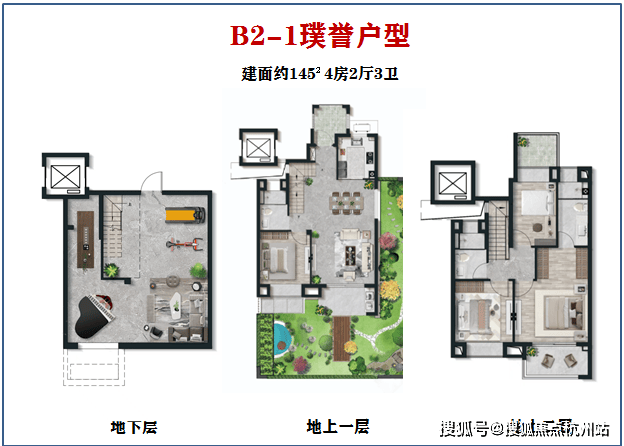 面积上与B1-1户型相同,建面约145㎡,功能区也大致相似。