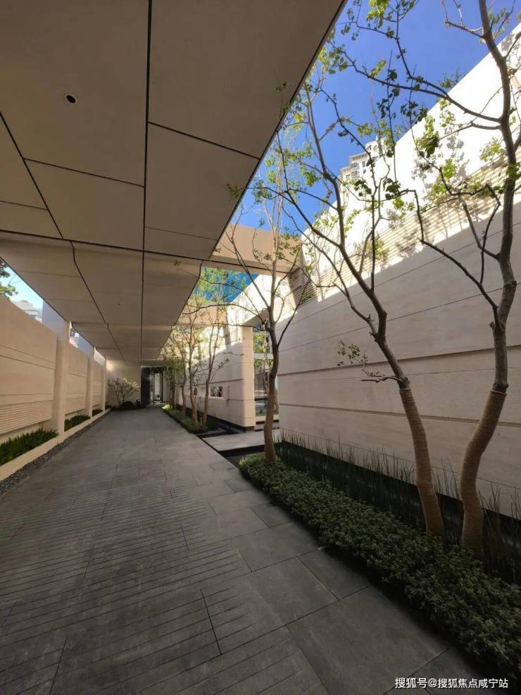 造景的用料也同样考究,大门景墙选用工艺复杂、用料扎实的沙漠风与白海棠石, 风雨连廊选用了经过多轮艺术工艺抛光打磨形成的 哑光荔枝面 的 沙漠风石。