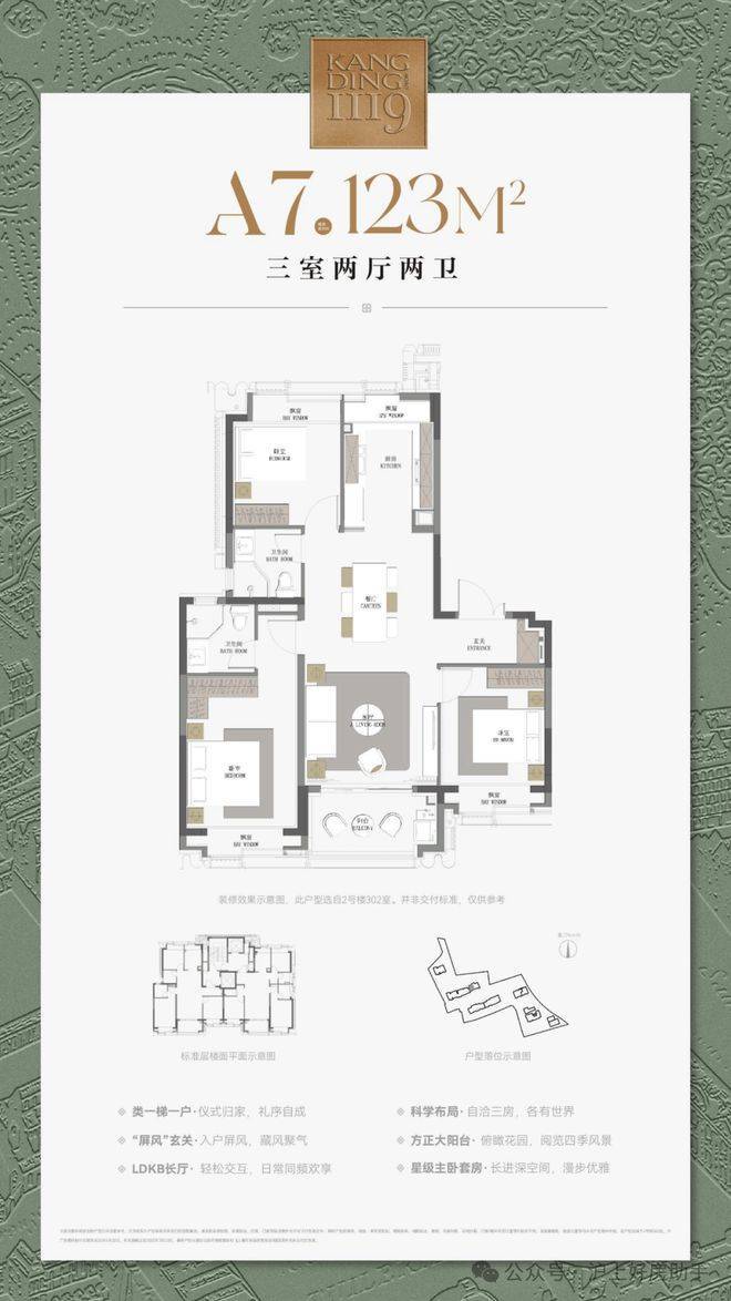 建筑面积约123㎡三房户型,飞机式布局,一镜到底的LDKB长厅,尽显隐贵静安风范;