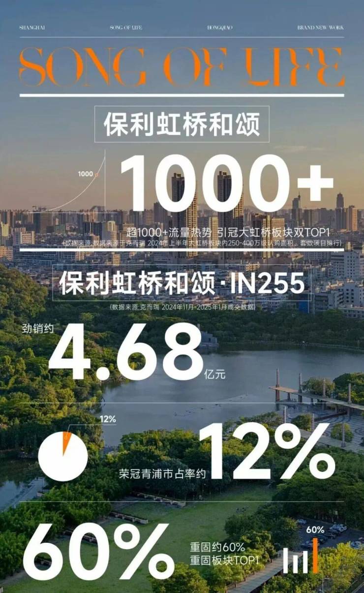 【保利虹桥和颂】以开篇者之姿,一举打破板块沉寂,凭借10000+人次现象级到访流量实力出位。继首作破局,战略纵深再落关键一子,【保利虹桥和颂·IN255】首开即强势斩获4.68亿元业绩,更以单盘青浦约12%、重固板块约60%市占率,给出了城市立新的标准答案。(数据来源:克而瑞2024年11月﹣2025年1月成交数据)