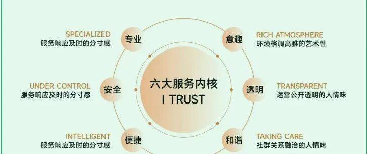保利物业将品质服务品牌"亲情合院"深度融入日常生活,以"让家更暖"初心理念,围绕真、善、美、和四大维度,在社区落地呈现" I TRUST "六大服务体系,打造有生命的空间,有温情的社区,有质感的生活。