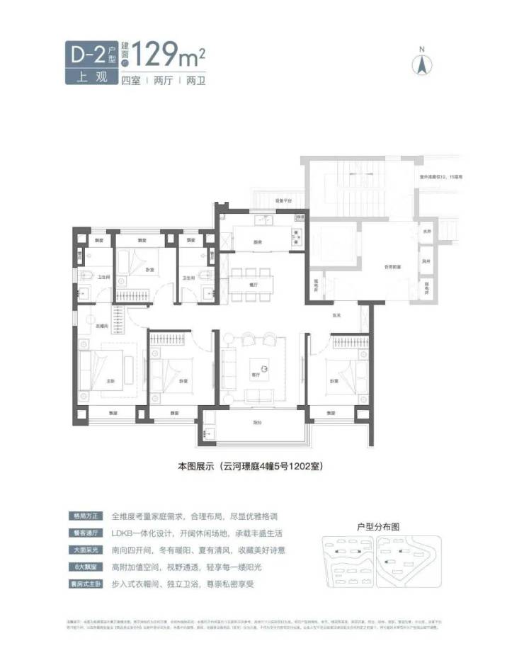 预算充足的小伙伴,可以选建面约129㎡4房,经典的三卧朝南、边套观景户型。
