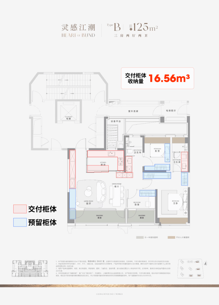 据小胖君手工统计,项目125㎡3房边套户型的整体交付柜子+预留衣柜,收纳空间可以达到约20.04m³!中间套户型也能达到约16.56m³!