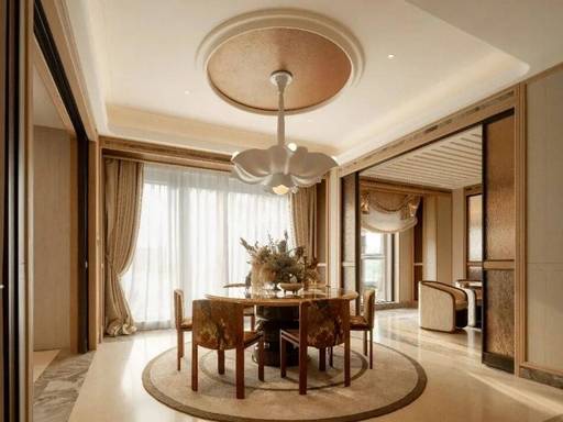 风格:现代简约轻奢,浅调精装,石材 + 木饰面 + 金属点缀
