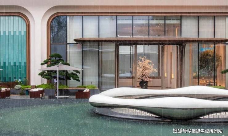 浮光池院水院会客厅,现已实景呈现,水景中央的艺术小品,如一滴水在湖面晕开,泛起阵阵涟漪。