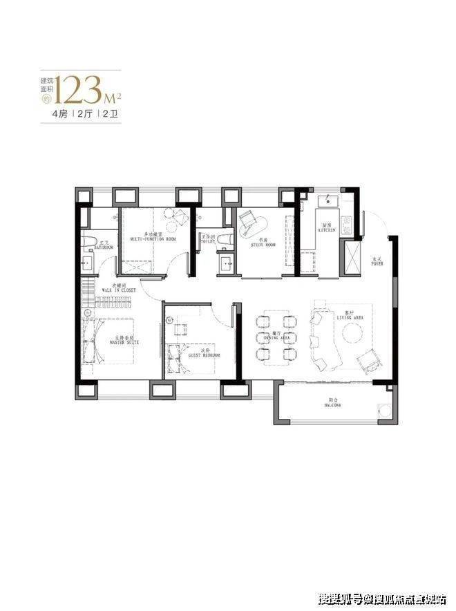 123㎡户型特点:厅6.3米面宽,可以扩展成多功能空间。