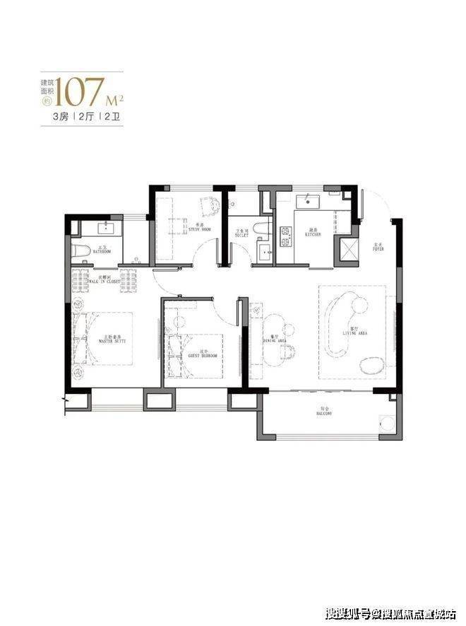 107㎡是103㎡户型的PLUS版,厅面宽达到5.5米。汲取了103㎡户型所有的优点;如餐客厅一体,U型厨房,动静分离设计,大尺度主卧套间,以及每个卧室都附大面积飘窗。