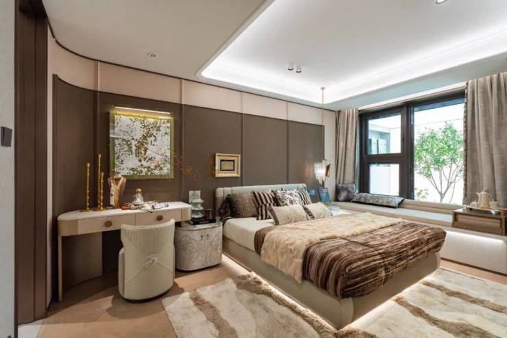 豪华的套房设计,北侧卫浴飘窗+南向床边双飘窗的设计,更是把这个空间的视野和收纳空间延展开来,尺度感真的很惊人。