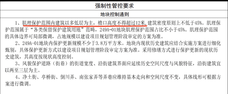 整体地块的强制性管控要求:建筑以多低层为主,檐口高度不得超过12米。