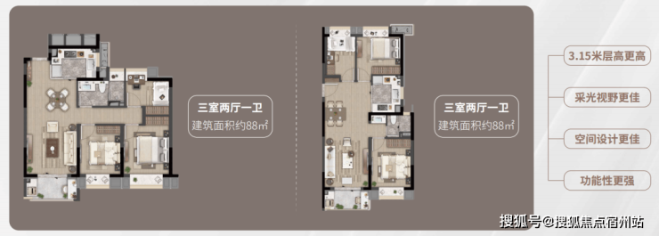 · 建面约88㎡3房:大虹桥范围不到90㎡的户型大部分都只做到2房,而虹桥灿耀星城该面积段实现3房功能性,让自住客户一步到位,也让该产品进入二手市场后具备降维打击的优势!
