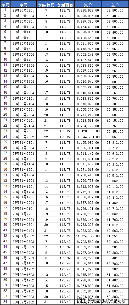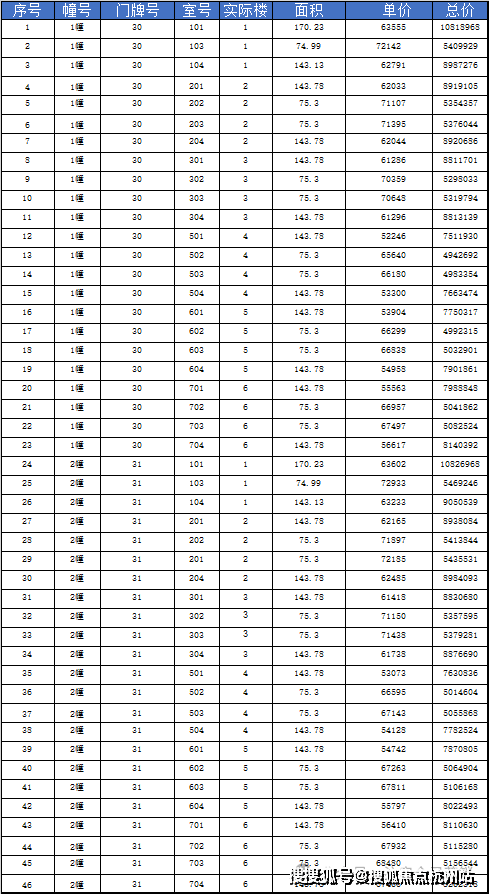 阳明花园广场二期(二阶段二期)一房一价表
