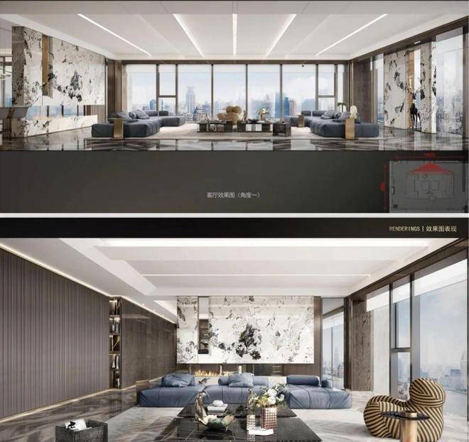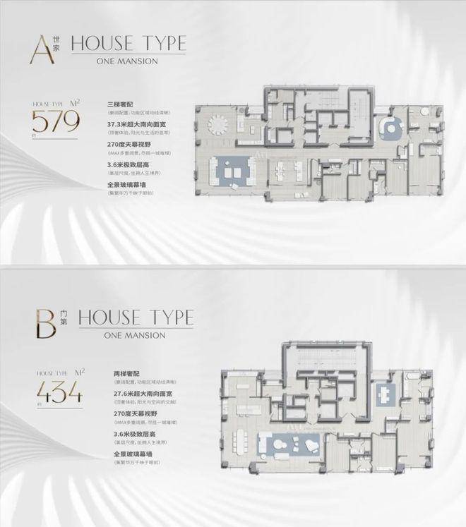 户型设计:主力户型为433-434㎡和580㎡,全部采用套房设计,层高达3.6米,配备全景玻璃幕墙和电动移门。