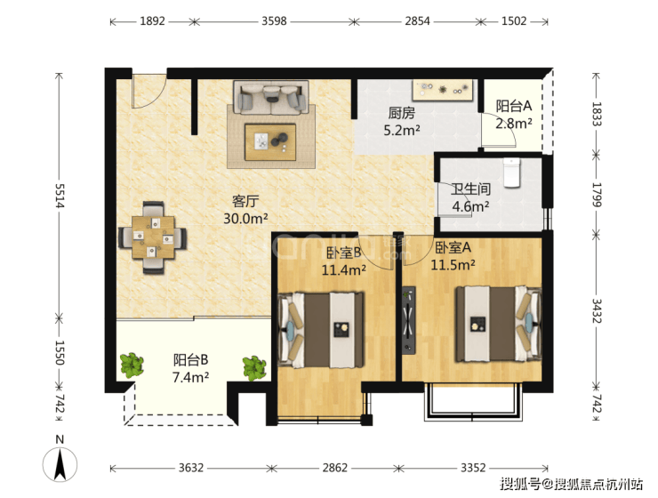 建面约94㎡2房