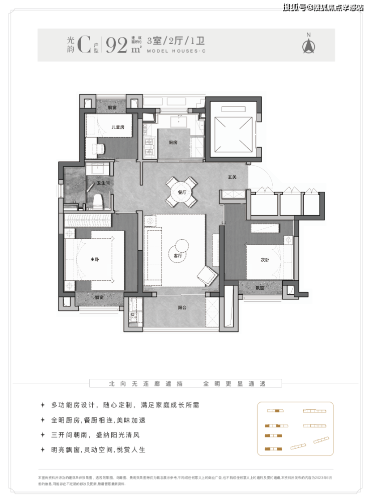 另外这个户型能更好实现南北通透,客厅-餐厅-阳台-厨房一线连通。