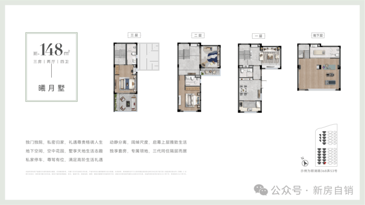 围合式合院,独立入户,三重院落有天有地有花园,人车分流,高窗墙比,窗窗见景,采光通风性佳
