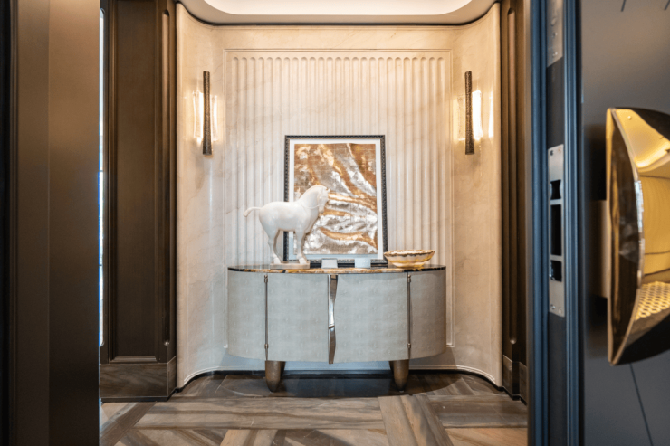 例如入户玄关铺设有“石材皇后”鱼肚印象,这种级别的奢石在很多顶豪项目中通常仅作局部镶嵌