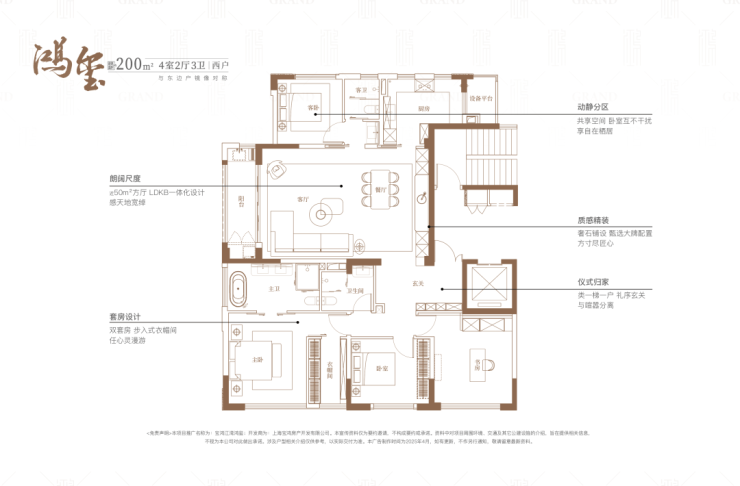 而在江湾鸿玺纯200平户型尺度下,舒适度完全拉满。双套房+次卧+书房设计,近50平方厅布局,给三代同堂的家庭生活真正的体面。动区、静区互补干扰,主卧与次卧,皆有私属独卫空间,再没有百平三房的逼仄。