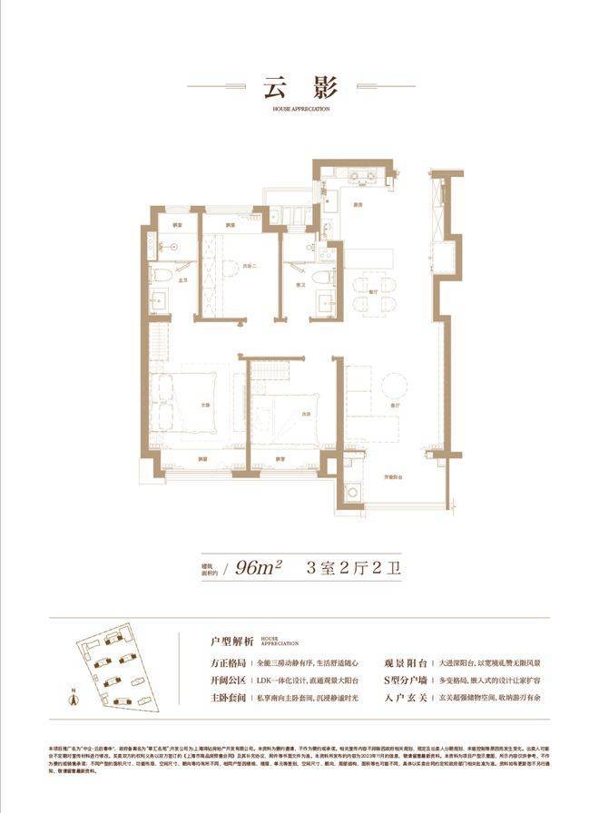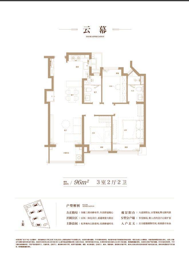 约 96㎡的 3 房 2 厅 2 卫户型,空间布局合理,每一寸空间都得到极致利用,毫无浪费。三个房间大小适中,满足家庭成员的居住需求。客厅宽敞明亮,与阳台相连,让阳光与清风肆意穿梭,为生活增添惬意与舒适。