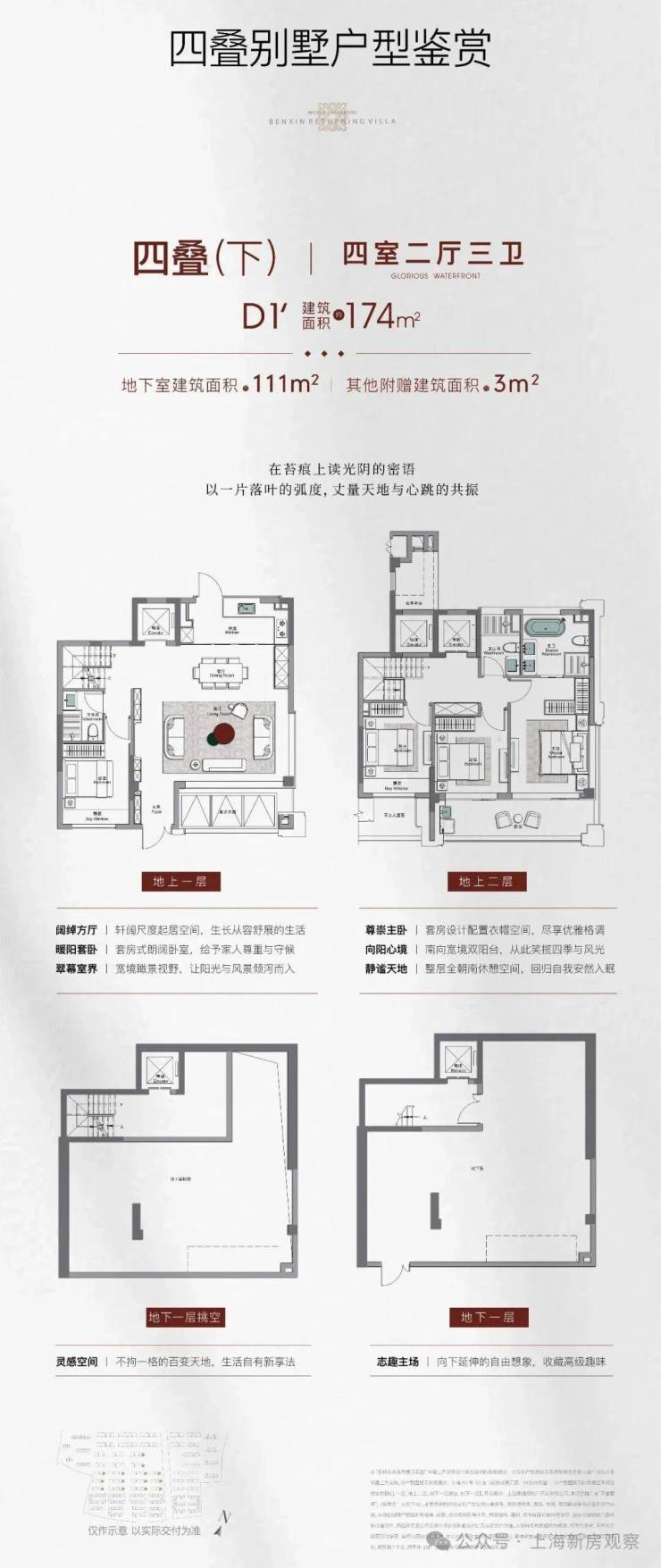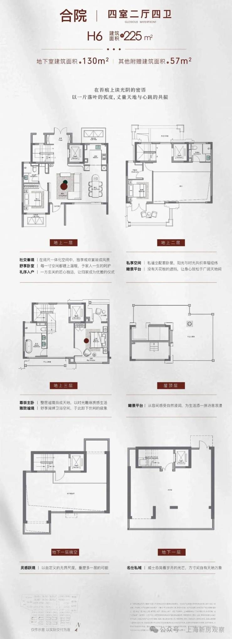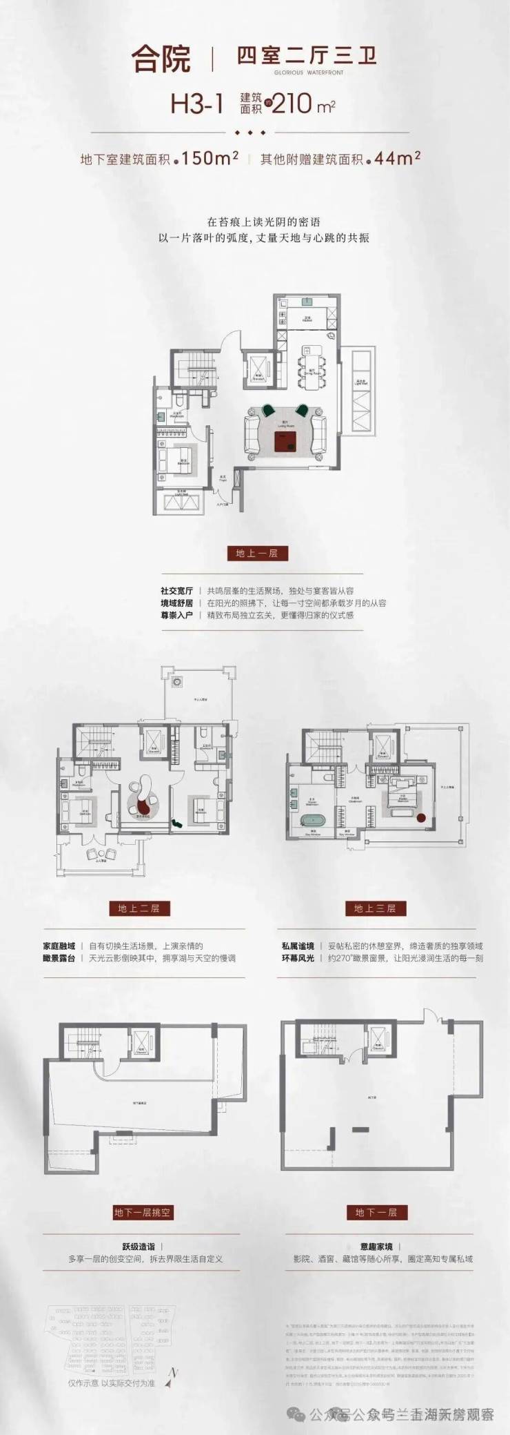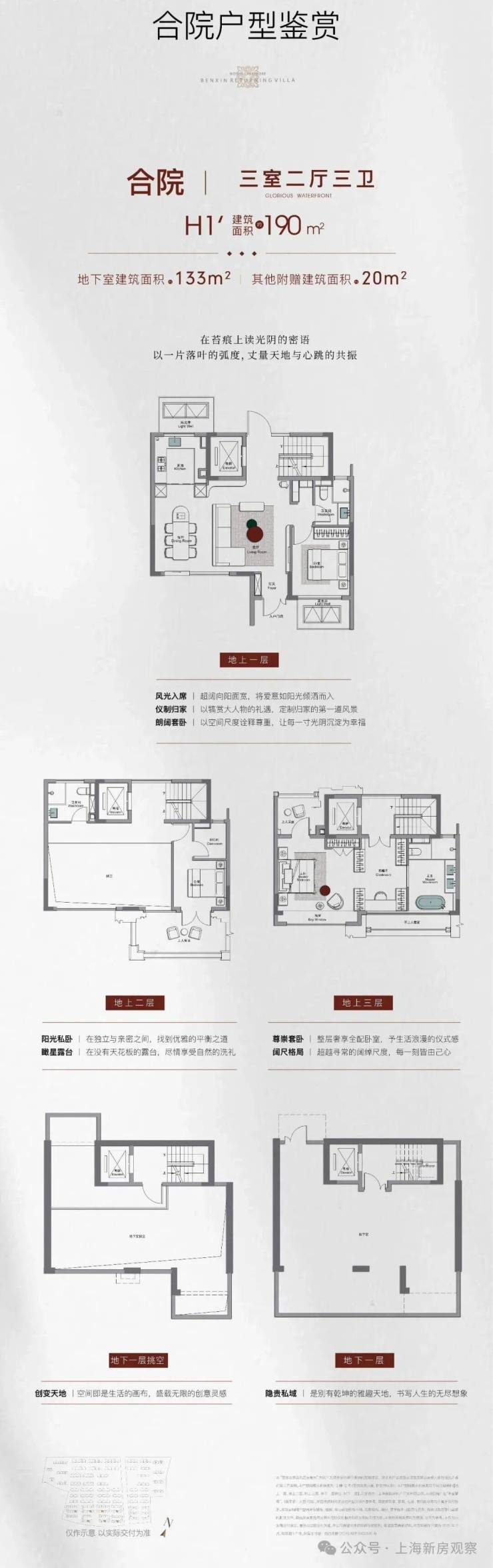 合院:建面约190㎡三室两厅三卫、约210-230㎡四室两厅三卫/四卫,附赠地下室+露台,总价预计约2000万;3层地上+地下室设计。