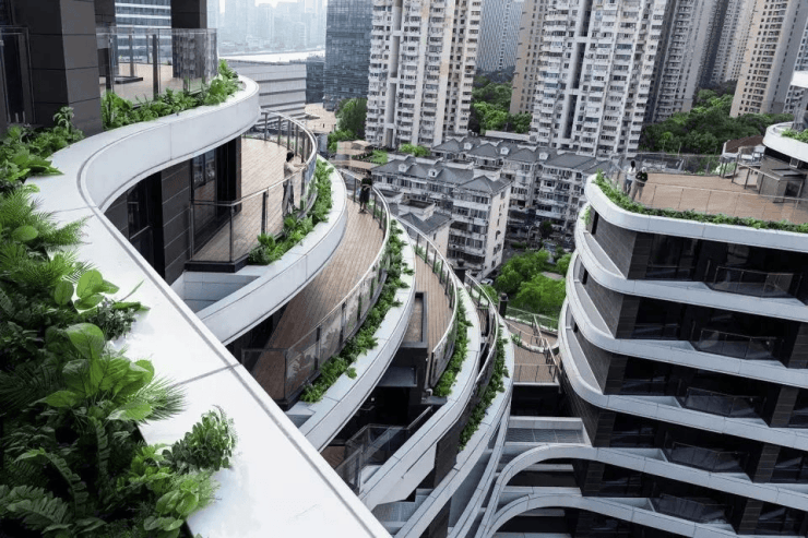 外立面采用玻璃幕墙现代简约风。建筑轮廓曲线蜿蜒,呈波浪线型层层迭高并后退,时尚感非常强。