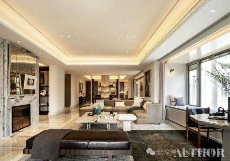 比如,弧形、奢石与灯光等相得益彰且设计感满满的架空层。