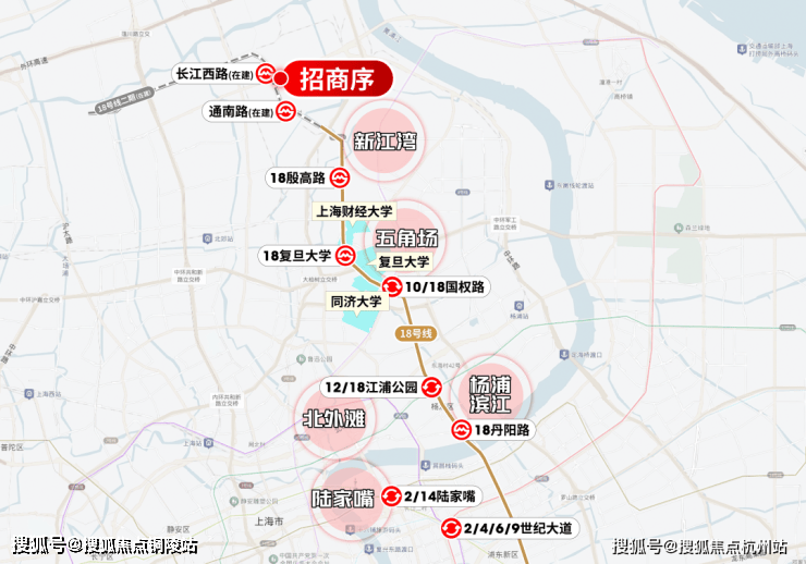 从长江西路出发(在建)出发,2站就是新江湾,4站财大,5站复旦,6站五角场,8站新华医院,11站杨浦滨江,12站陆家嘴滨江...