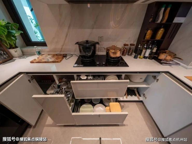 油烟机选用方太(或同等品牌)创新机型,隐藏式升降油烟机,挥手即可控制,市场零售价达13500+,并附赠洗碗机;