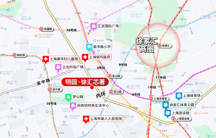 明园·徐汇芯著位于徐汇内环旁,与徐家汇新一代地标徐家汇中心(在建)直线距离仅约1.2公里。