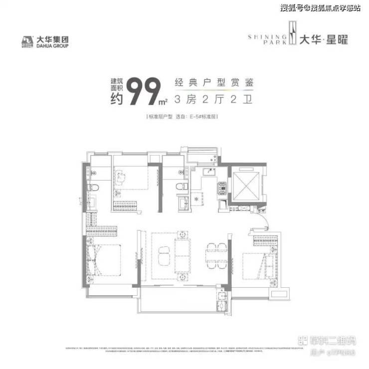 【大华星曜】售楼处预约热线:400-8855-420📲建面约99㎡3房2卫是项目的主力户型。四开间朝南,大横厅的设计,让这个户型有着不亚于宽绰大三房的尺度感和采光面,再加上宽景阳台的设计,这个户型的居住舒适度在同面积段户型中,称得上出类拔萃了。另外,3房2卫5飘窗的设计,保证了主人的私密空间,也保证了室内的收纳空间。