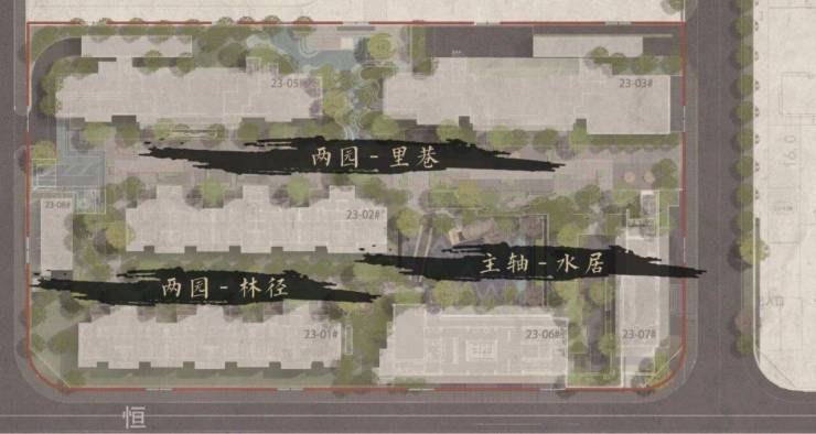 一轴:以水居记忆为轴线串联,打造多个景观节点,形成中心景观游园,搭配叠山、理水等东方园林元素,延续东方美学园林的起承转合,层层递进,营造东方大宅典范,让业主在社区内就能感受自然与人文的融合之美。