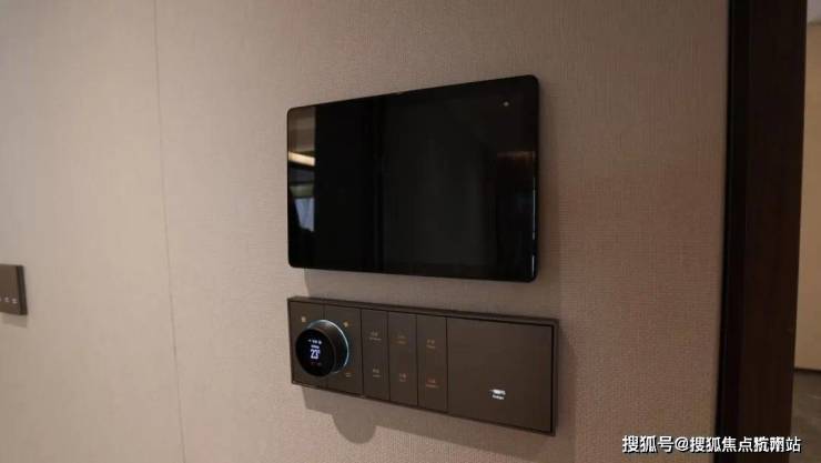 换好鞋,起身可以看到入户门旁配置了窄边框可视对讲,灰色高标肤感开关面板,三合一温控面板,未来可以通过它远程调节灯光,新风,中央空调,地暖,实现智能生活,到家就能享受舒适的居住状态。