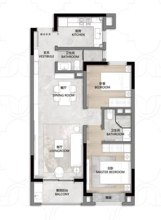 第二个亮点,是动静分离+客餐厅一体化设计,功能区和休息区互不干扰,客餐厅、厨房等公共活动区集中在一侧,卧室等休息区全部一侧,保证了私密性!