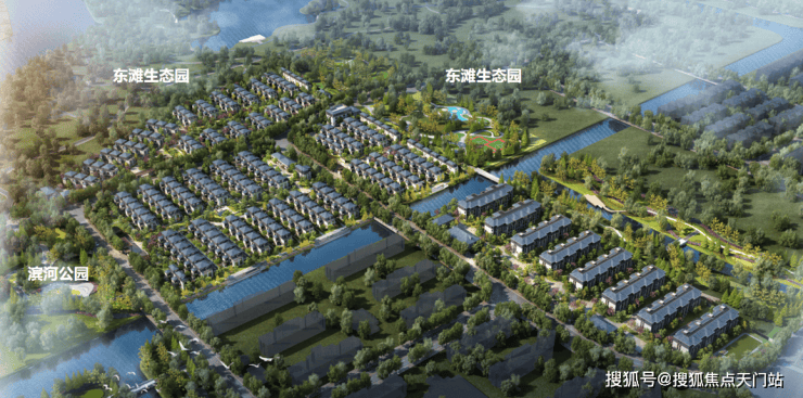 东北两面有东滩生态园,西面是滨河公园,周边水光灵动,归野自然。