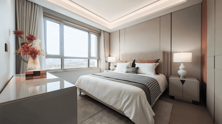 另外,一般项目为了凸显尺度感不会放床头柜,而在该户型,宝华不仅放了正常尺寸的大床,还配了两个大床头柜,主卧空间一目了然。