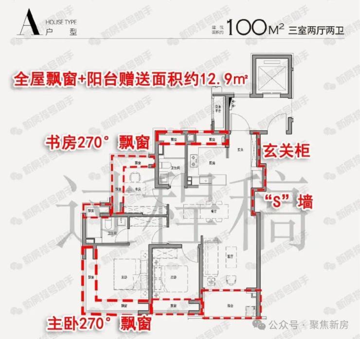 3、空间升级:超配双270°飘窗格局!市面上很少会有主卧及书房均设计270°飘窗的百平户型,稀缺性不言而喻~