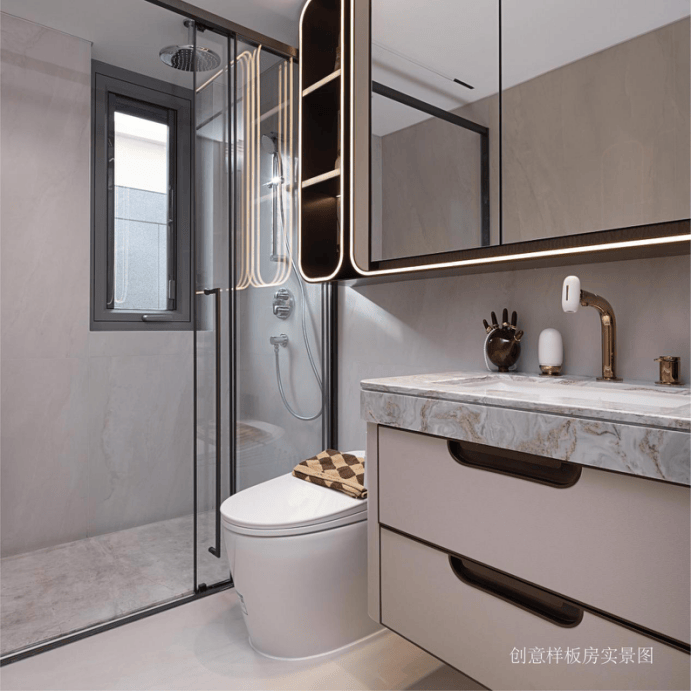 项目的价值提升力体现在严选的品牌体系与人性化细节中。国际一线品牌的选用构成了品质基底,而特别值得关注的是对特定生活场景的深度挖掘。例如,专为女主人打造的双补光镜柜、恒温美妆冰箱等“女神美妆四件套”,将卫浴空间升级为个性化的美妆疗愈空间。